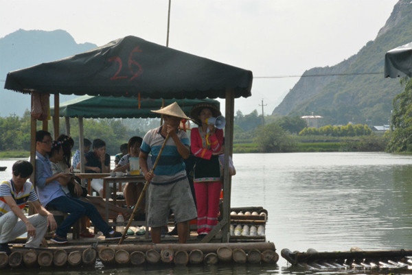 我們一行人乘坐幾條竹筏,逆流而上。隨行的還有一位壯族姑娘,扮演現(xiàn)代版的劉三姐與我們大家對歌。她歌如夜鶯,人若桃花,熱情好客,并且為我們解說當(dāng)?shù)氐拿袼罪L(fēng)情。在對歌的過程中,壯族姑娘站在船頭向大家拋繡球,方佛我們又回到了當(dāng)年阿牛哥與劉三姐的世界。有些人從艄公手里接過長蒿,向青草更清處漫溯。然而也有人在原地打轉(zhuǎn),還不停地碰撞他人竹筏。