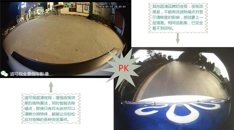 供證據,行車記錄等于白裝了。而道可視360度全景擁有四路超清攝像頭,每個攝像頭都擴大了通光的光圈,在夜晚能夠捕獲更清晰圖像。在微弱星光下,利用增