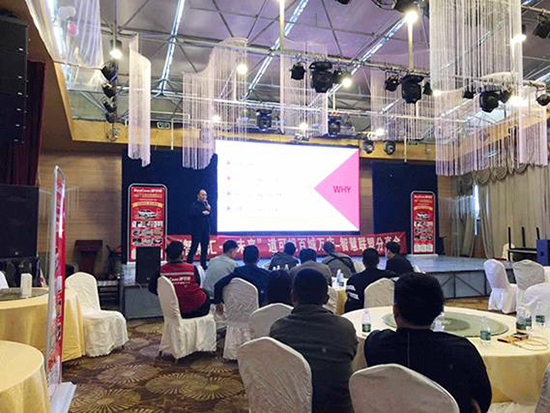 道可視代理商鄭州云游汽車銷售有限公司趙總率先進行道可視智慧聯盟店政策的主題講演,他表示,2019年道可視將在全國各省地級市舉辦多場招商會,共建立超4000家智慧聯盟店,他從門店產品的售前準備、售中執行、售后服務三個層面進行了更細致化的闡述。